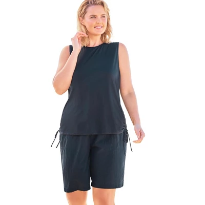 This casual swim tank in a relaxed fit is great for swimming or as a cover-up for sun protection. Made with a sleeveless silhouette and ruched side ties, pair it with swim shorts or a bikini bottom. Wear over your favorite tankini or swimsuit. Chlorine-resistant fabric. Unlined. Crewneck.