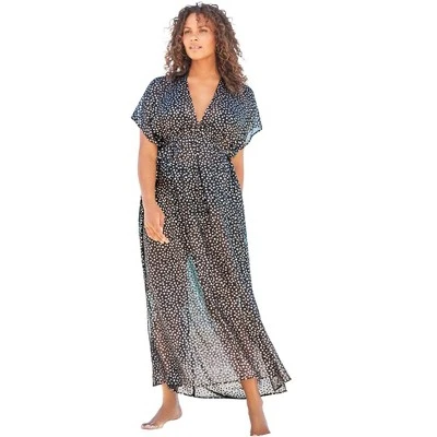 Add a hint of romance with this V-neck caftan. A self-tie waist and dramatic side slits make it a go-to for all beach to boardwalk adventures. Prints feature shiny metallic foil.